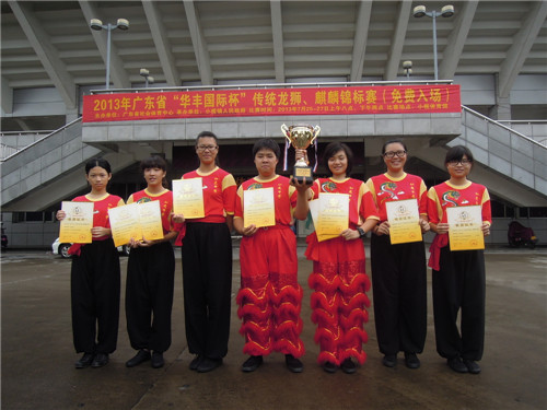 由廣東省社會體育中心主辦,中山市小欖鎮(zhèn)人民政府承辦的2013年廣東省傳統(tǒng)龍獅、麒麟錦標賽于2013年7月27日在小欖鎮(zhèn)體育館舉行。本會女子南獅隊在梁錫英總教練的帶領(lǐng)下首次參賽,并以《瑞獅獻藝展英姿》的南獅套路奪得傳統(tǒng)南獅二等獎。本會女子醒獅隊雖然成立時間不長,且身為女生,在體力上比男生稍差,但巾幗不讓須眉,她們利用暑假假期,風雨不改堅持訓(xùn)練,終于戰(zhàn)勝體力,超越自我,在全省124支精英隊伍中脫穎而出,取得優(yōu)異成績。