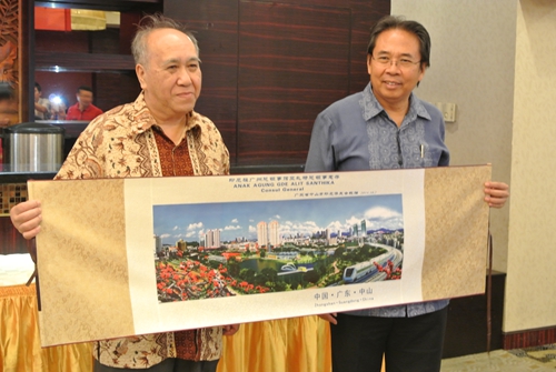 在熱烈友好的氛圍中,大家在一起座談??傤I(lǐng)事、余主席、容會(huì)長在座談會(huì)上先后發(fā)言。座談會(huì)后,大家移步到金鉆酒店與在那里等候的部分中山印尼歸僑見面。宴會(huì)上余主席、總領(lǐng)事、容會(huì)長分別發(fā)表熱情洋溢的講話。中山印尼歸僑紛紛起立與總領(lǐng)事一行舉杯,歡愉交談。大家沉浸在熱情友好溫馨的氛圍之中。容余扶會(huì)長代表中山市印尼僑友聯(lián)誼會(huì),向總領(lǐng)事贈(zèng)送有中山市區(qū)最新景區(qū)畫面的中國絲綢,作為此行的紀(jì)念品。容會(huì)長代表僑友會(huì)對(duì)總領(lǐng)事一行在節(jié)日時(shí)刻,專程探望中山印尼歸僑表示衷心感謝。