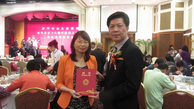 市僑聯(lián)余志勇副主席向澳門中山隆都同鄉(xiāng)會常務(wù)副會長蕭滿群女士頎發(fā)顧問聘書