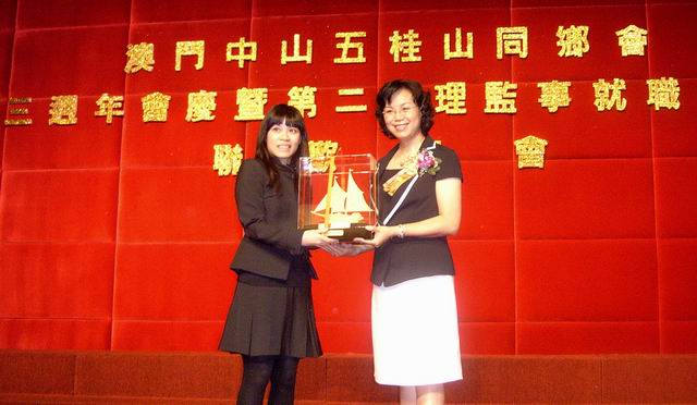 市委常委、統(tǒng)戰(zhàn)部部長梁麗嫻代表中山市祝賀團(tuán)向澳門中山五桂山同鄉(xiāng)會(huì)致送紀(jì)念品