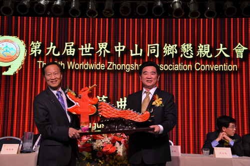 市祝賀團(tuán)團(tuán)長陳茂輝市長向第九屆世界中山同鄉(xiāng)懇親大會(huì)主辦方美國陽和總會(huì)館贈(zèng)送紀(jì)念品