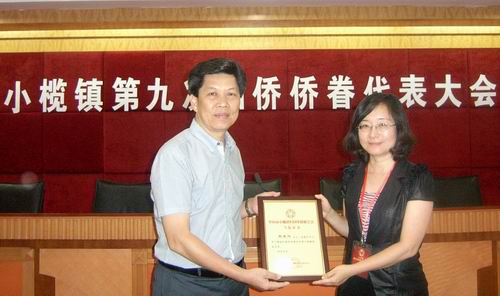 市僑聯(lián)主席余志勇向小欖鎮(zhèn)僑聯(lián)第九屆委員主席張曉陽(yáng)頒發(fā)當(dāng)選證書(shū)