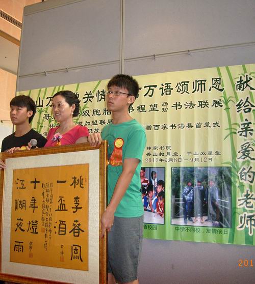 旅居哥斯達(dá)黎加的鄉(xiāng)親程錫銘是市僑聯(lián)第十二屆委員會海外顧問,其退休前一直在中山從事文化工作,移居海外后繼續(xù)致力傳播中國文化。程望玚、程望玥為其雙孫,目前在中山五桂山學(xué)校就讀。據(jù)悉,程望玚、程望玏從小在哥斯達(dá)黎加長大,不懂漢語,不會說普通話?;氐街袊蠈W(xué)后,兩人從零起步,補學(xué)漢語,并且受爺爺程錫銘的影響愛上書法,進(jìn)步很快。兩兄弟曾舉辦過書畫作品展,扎實的書法功底得到社會各界人士的贊許。