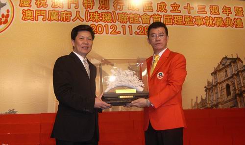 余志勇主席代表中山市祝賀團致送紀(jì)念品,澳門廣府人(珠璣)聯(lián)誼會常務(wù)副會長余干成代為接受