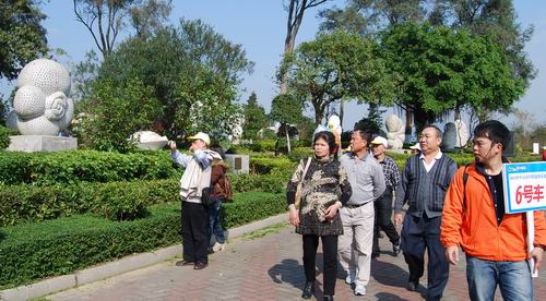 僑友們?cè)谟锌紫x(chóng)雕塑園參觀