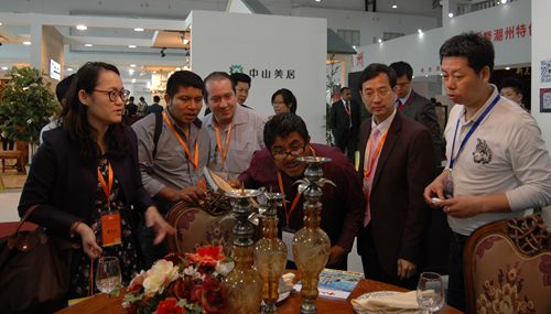 市僑聯(lián)領(lǐng)導(dǎo)干部陪同參會(huì)外國(guó)企業(yè)家在了解中山產(chǎn)品。