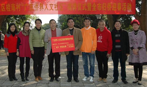 在今年的歸僑迎春活動(dòng)中,僑友們參觀了“廣東僑界人文社區(qū)”、“中山市秀美鄉(xiāng)村”五桂山桂南村,欣賞了當(dāng)?shù)氐目图绎L(fēng)情精彩文藝表演,游覽了五桂山和南區(qū)的華僑與歷史人文景觀,共同感受僑鄉(xiāng)中山的文化魅力,分享家鄉(xiāng)社會(huì)發(fā)展的新成就,從而增加對(duì)祖國(guó)、家鄉(xiāng)的了解和熱愛(ài)。在參加迎春活動(dòng)的全體僑友們的見(jiàn)證下,市僑聯(lián)主席余志勇,五桂山辦事處副主任郭鳳儀等,為五桂山區(qū)桂南村“廣東僑界人文社區(qū)(示范點(diǎn))”進(jìn)行了揭牌;市僑聯(lián)青年委員會(huì)捐出21500元作為僑界人文社區(qū)桂南村樟樹(shù)林的養(yǎng)護(hù)費(fèi)用;市僑聯(lián),市僑青委,五桂山僑聯(lián)及桂南村僑聯(lián),市印尼、新馬泰、越南、亞美僑友聯(lián)誼會(huì)等,在桂南村的樟樹(shù)林分別栽下了代表友誼和發(fā)展的4棵樟樹(shù)。