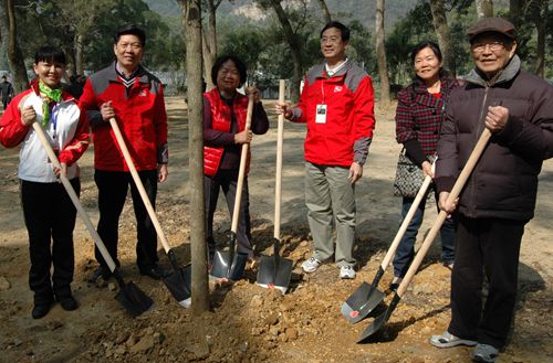 市僑聯(lián)領(lǐng)導(dǎo)與退休老同志共同種植樟樹(shù)。