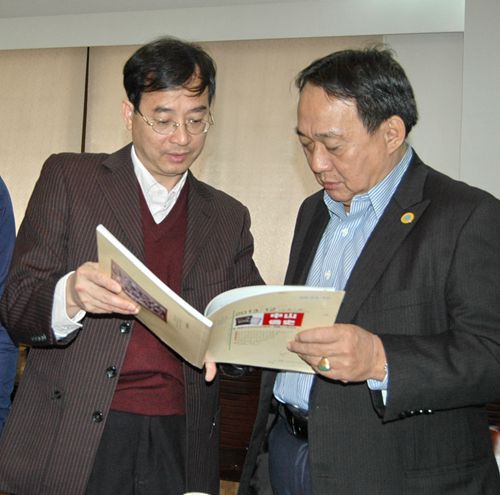 楊彪副主席向譚少鴻先生介紹由市僑史學會主辦的《中山僑史》登載有關(guān)檳城中山會館文章。